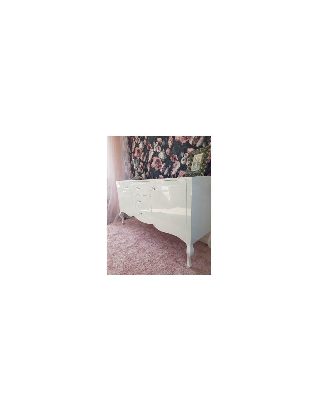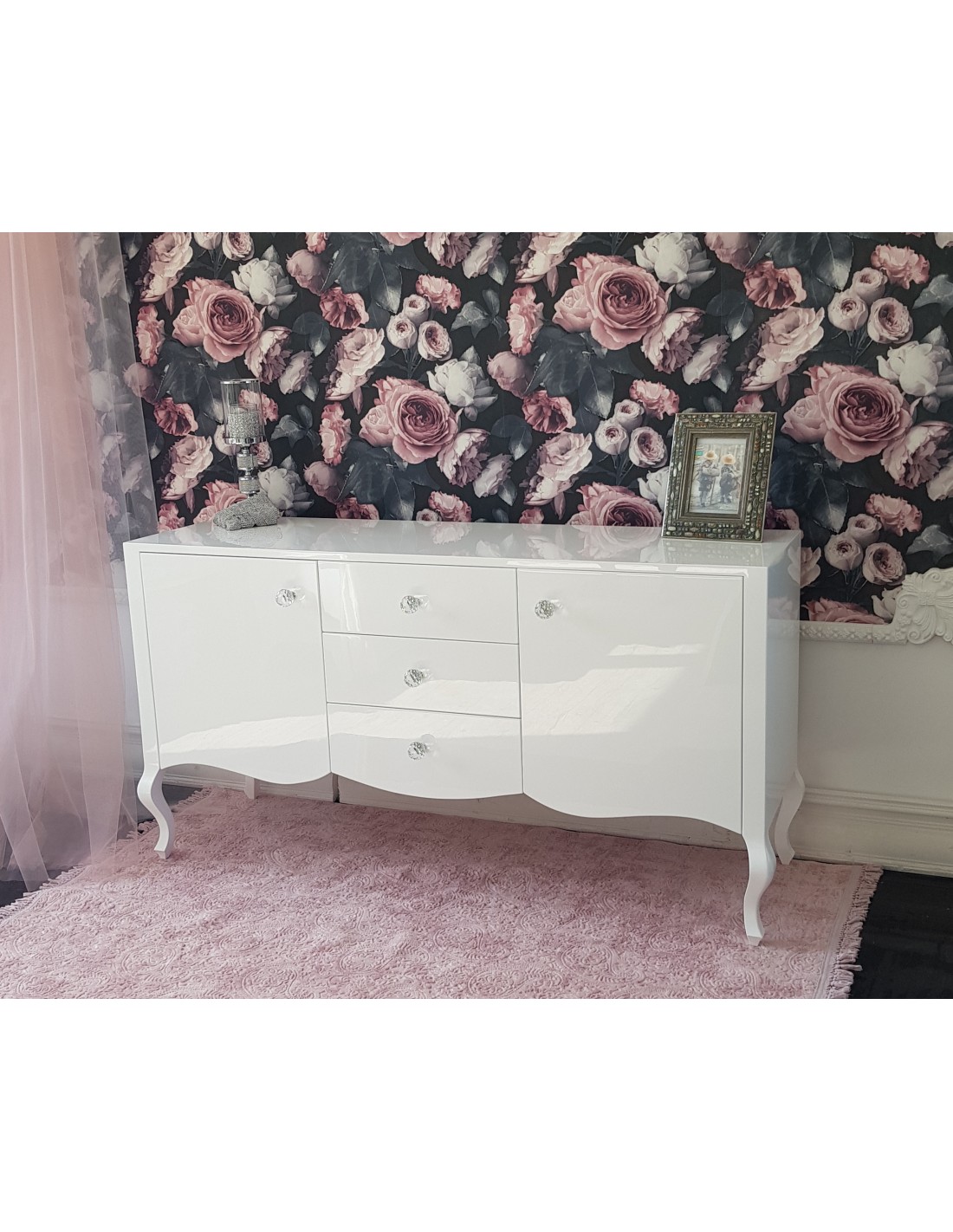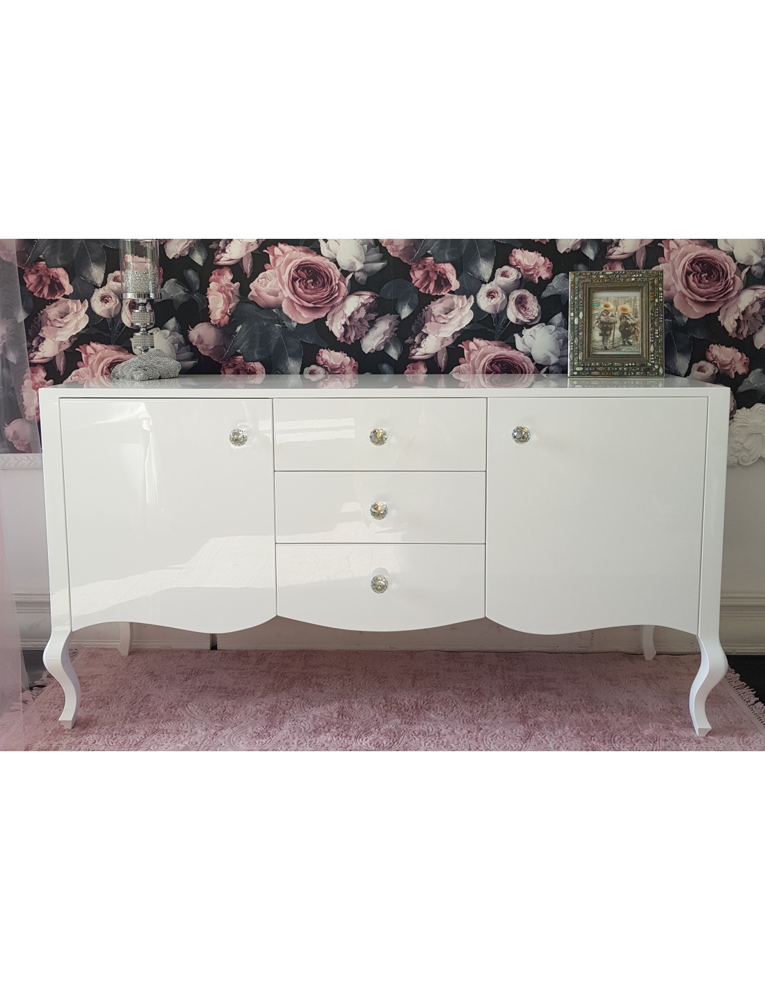Szuflady wykończone włoskimi uchwytami ze szklanymi kryształami, zaopatrzone w prowadnice z cichym domykiem firmy Blum.