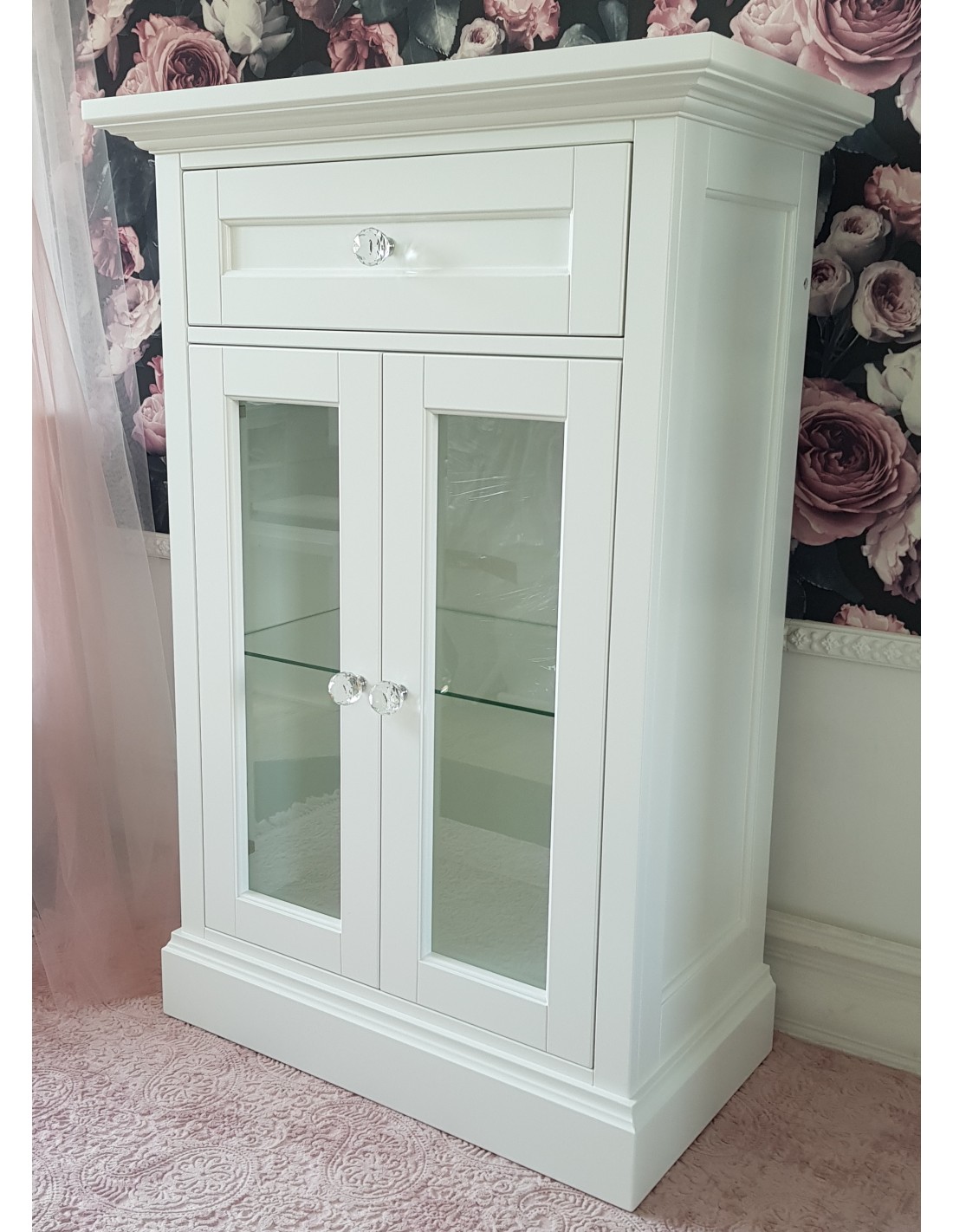 Komoda biała wyposażona w szufladę oraz drzwiczki. W środku szklana półeczka z podświetleniem.