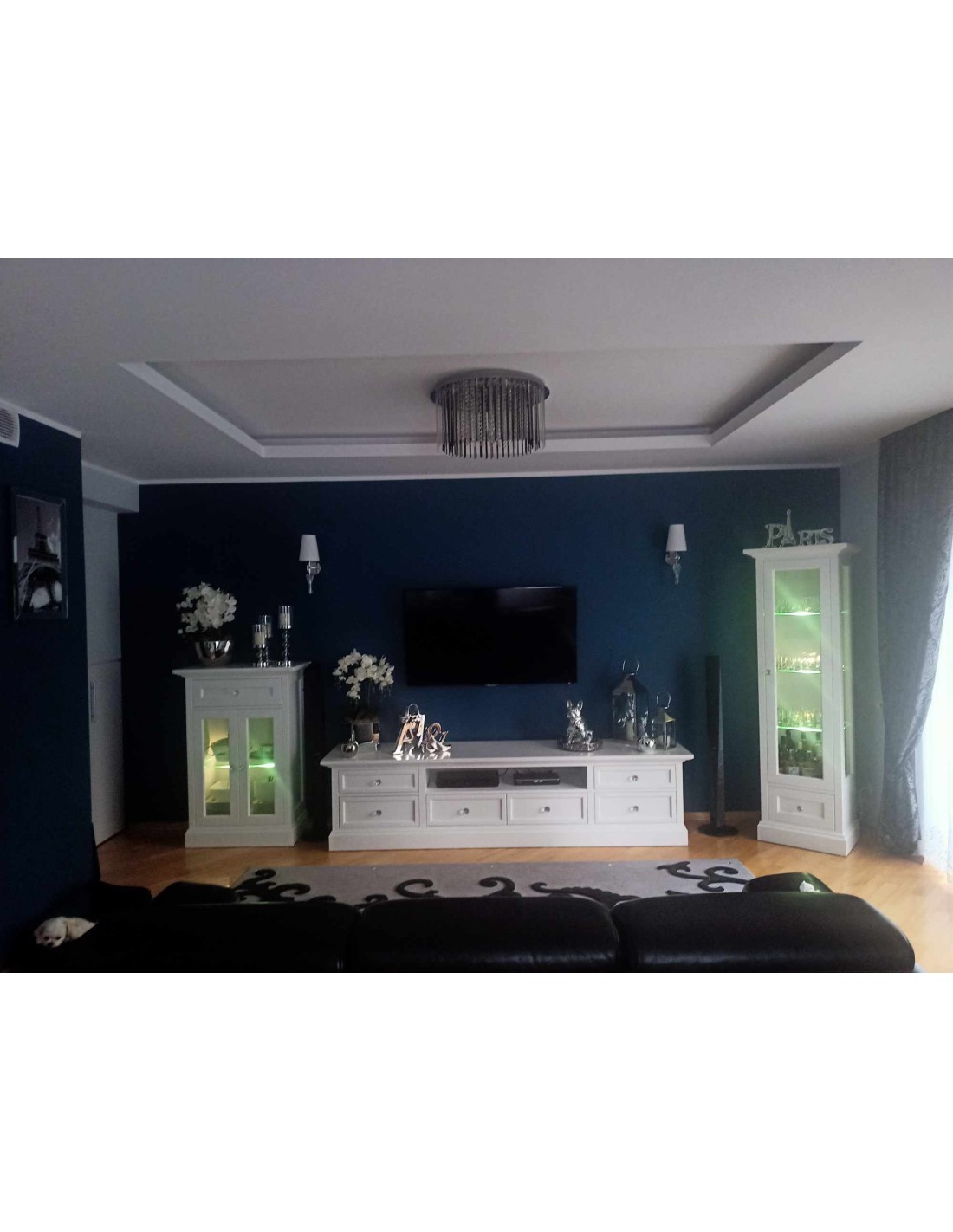 Stylowa komoda w kolorze białym. Zaopatrzona jest w 6 szuflad z cichym domykiem firmy Blum. Szuflady wykończone szklanymi uchwytami o wysokości 3,5cm. RTV wysyłana jest w całości. Produkowane przez nas meble wykonujemy pod wymiar.