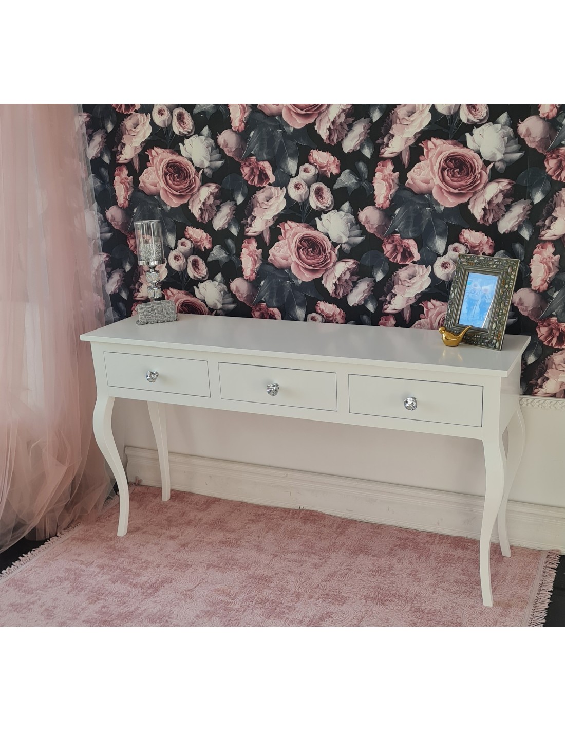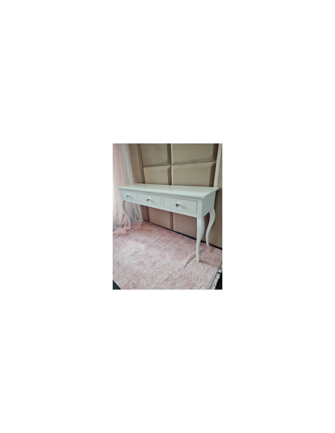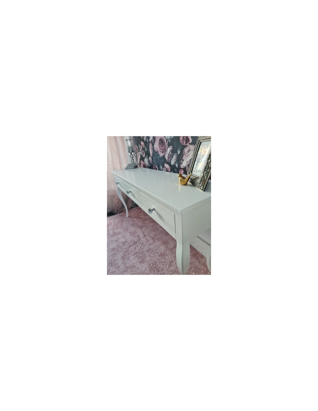 Konsolka wykonana jest z drewna brzozowego, posiada jedną szufladkę. Uchwyt kryształowy. Mebel bardzo dekoracyjny, na nóżkach w stylu LUDWIK. Wybarwiona na kolor biały. Na wysokości 19 cm znajduje się dodatkowa półka. Mebel wysyłany jest w całości. Istnieje możliwość przygotowania konsoli pod umywalkę na życzenie klienta.