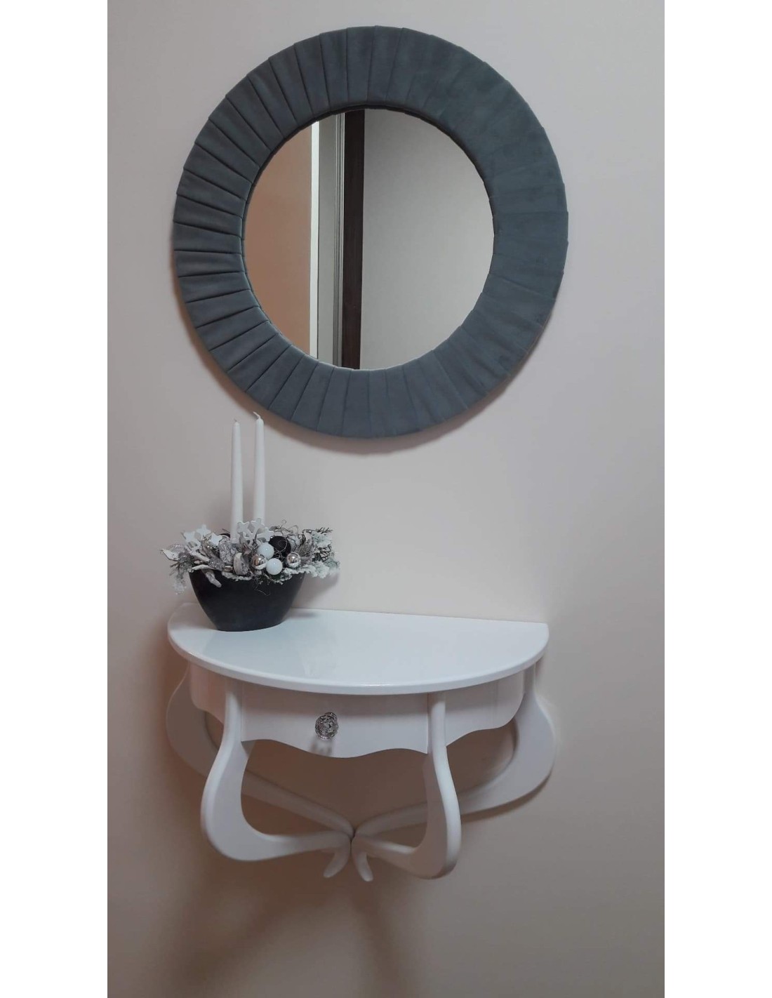 Konsolka wykonana jest z drewna brzozowego, posiada dwie szuflady. Krzyształowe uchwyty. Mebel bardzo dekoracyjny, na nóżkach w stylu LUDWIK. Wybarwiona na kolor biały. Mebel wysyłany jest w całości. Produkowane meble przez naszą firmę wykonujemy pod zamówienia klientów.