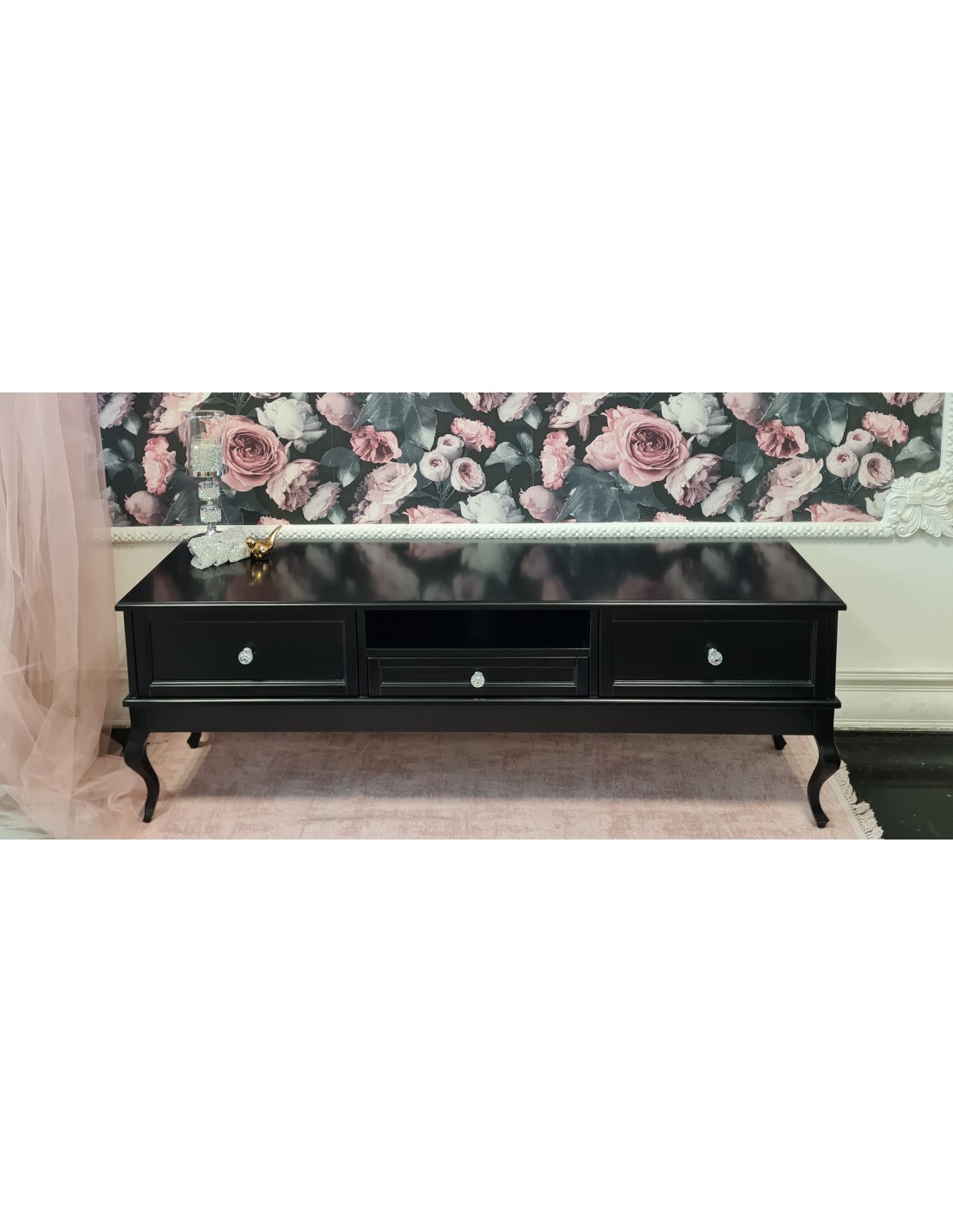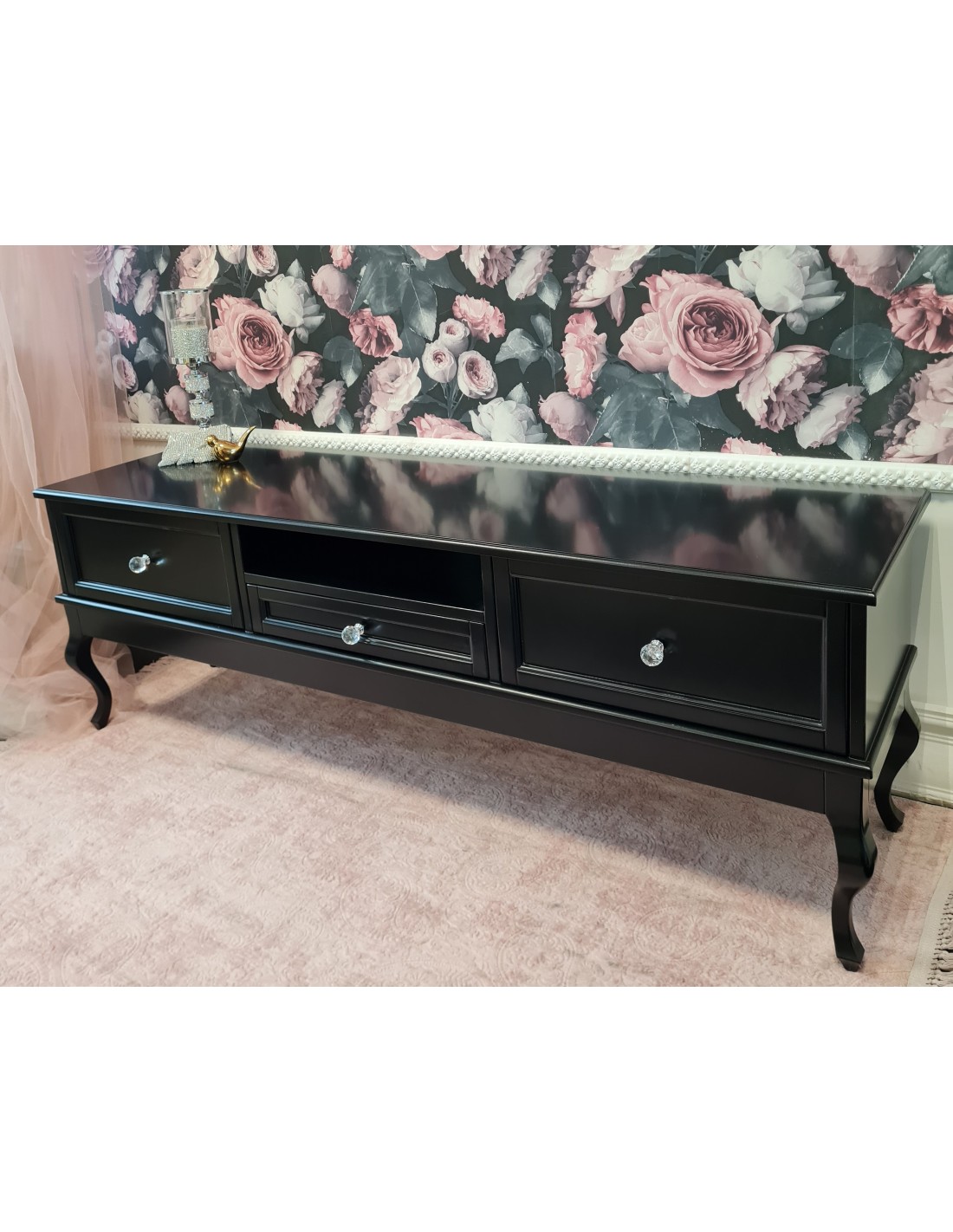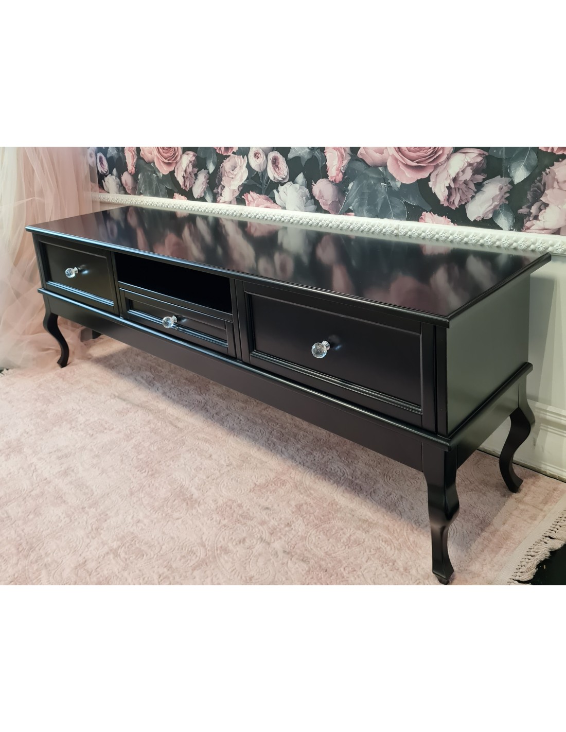 Konsolka wykonana jest z drewna brzozowego, posiada dwie szuflady. Krzyształowe uchwyty. Mebel bardzo dekoracyjny, na nóżkach w stylu LUDWIK. Wybarwiona na kolor czarny. Mebel wysyłany jest w całości.