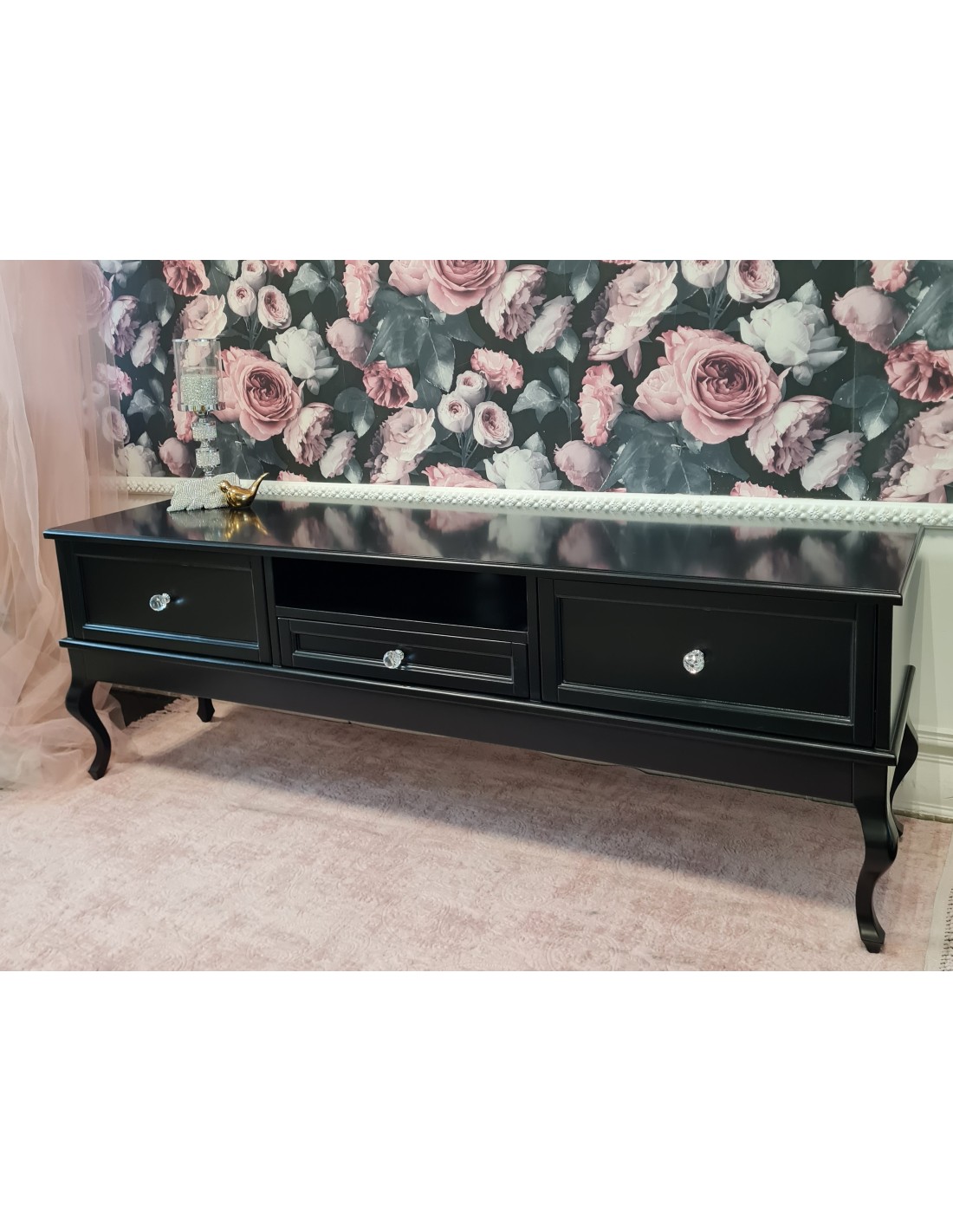 Komoda LUDWIK wykonana jest z drewna na giętych nogach, wyposażona w 4 szuflady z prowadnicami z cichym domykiem firmy BLUM. Urocze kryształowe szlifowane uchwyty w kształcie kulek o wysokości 3,5 centymetra. Przedmiot bardzo dekoracyjny, kolor czarny. Komoda jest wysyłana w całości.