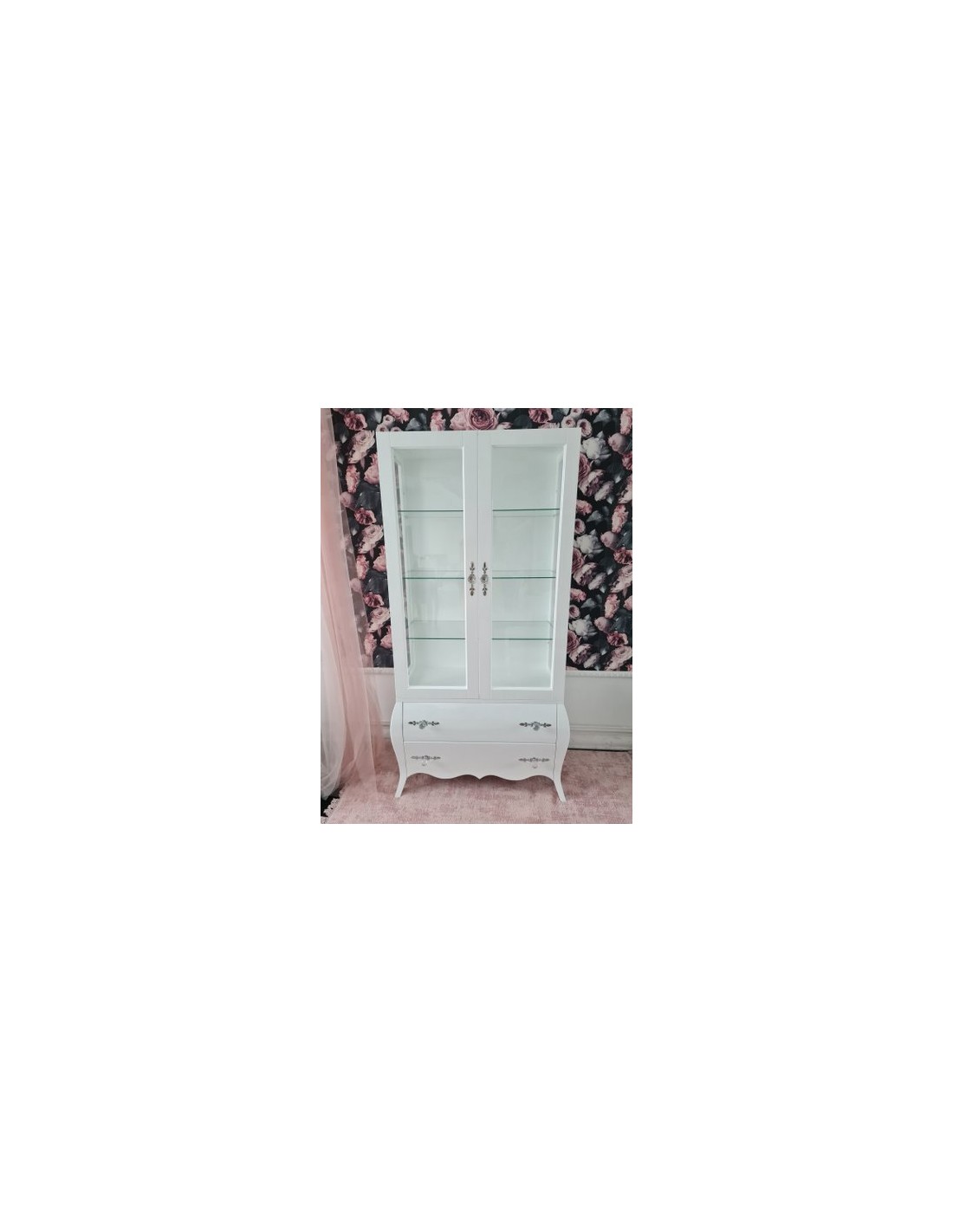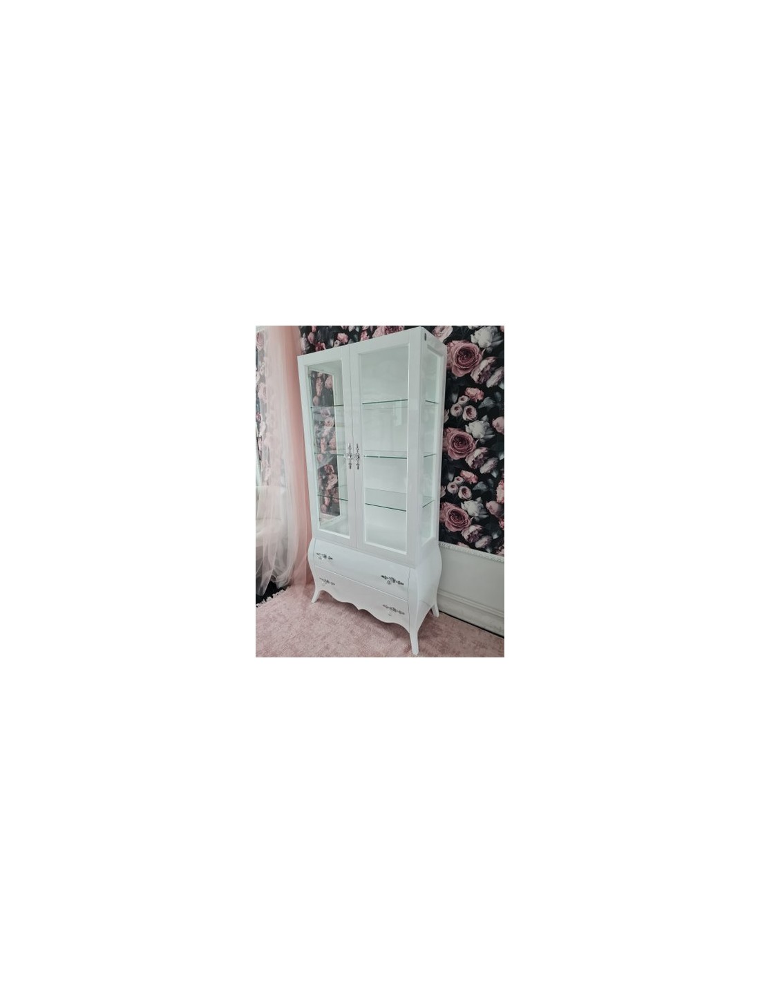 Witryna GLAMOUR na giętych nogach, wyposażona w 2 szuflady oraz dwoje drzwiczek.